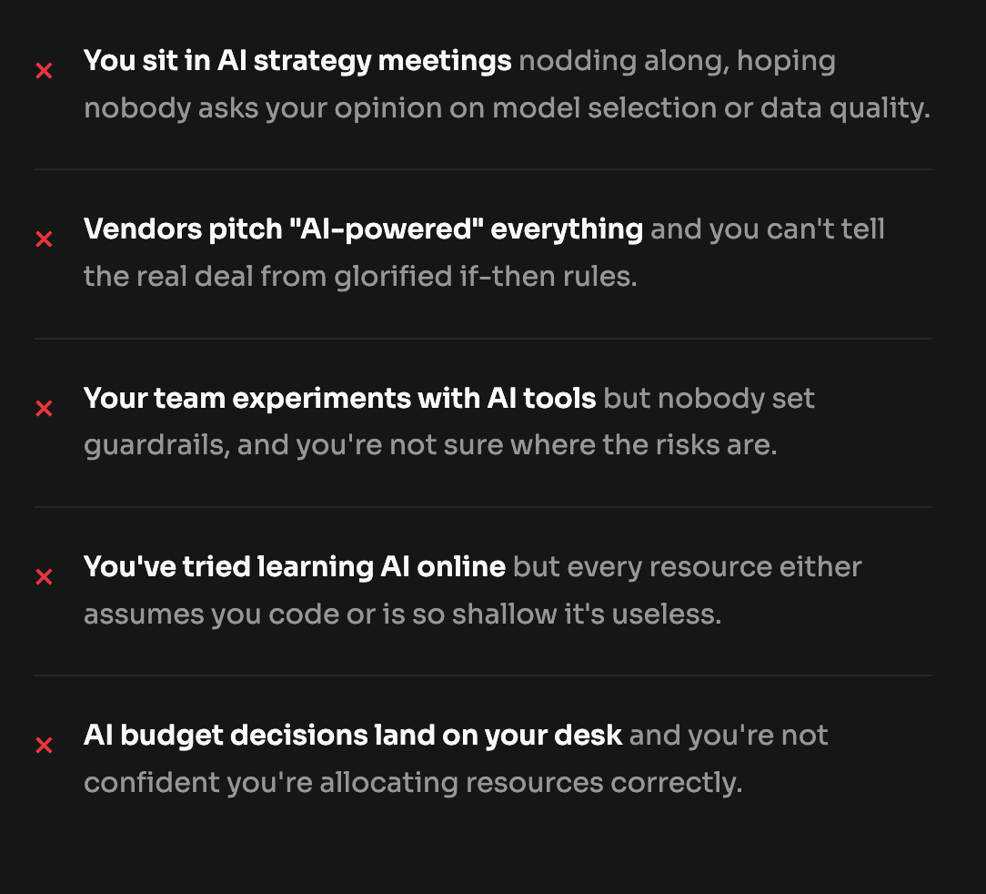 Become that employee that gets praised for the great ideas and right questions! In 11 structured modules, that you can follow in one afternoon, you'll go from "I use ChatGPT" to confidently evaluating AI projects, asking the right questions, and leading AI adoption in your organization.